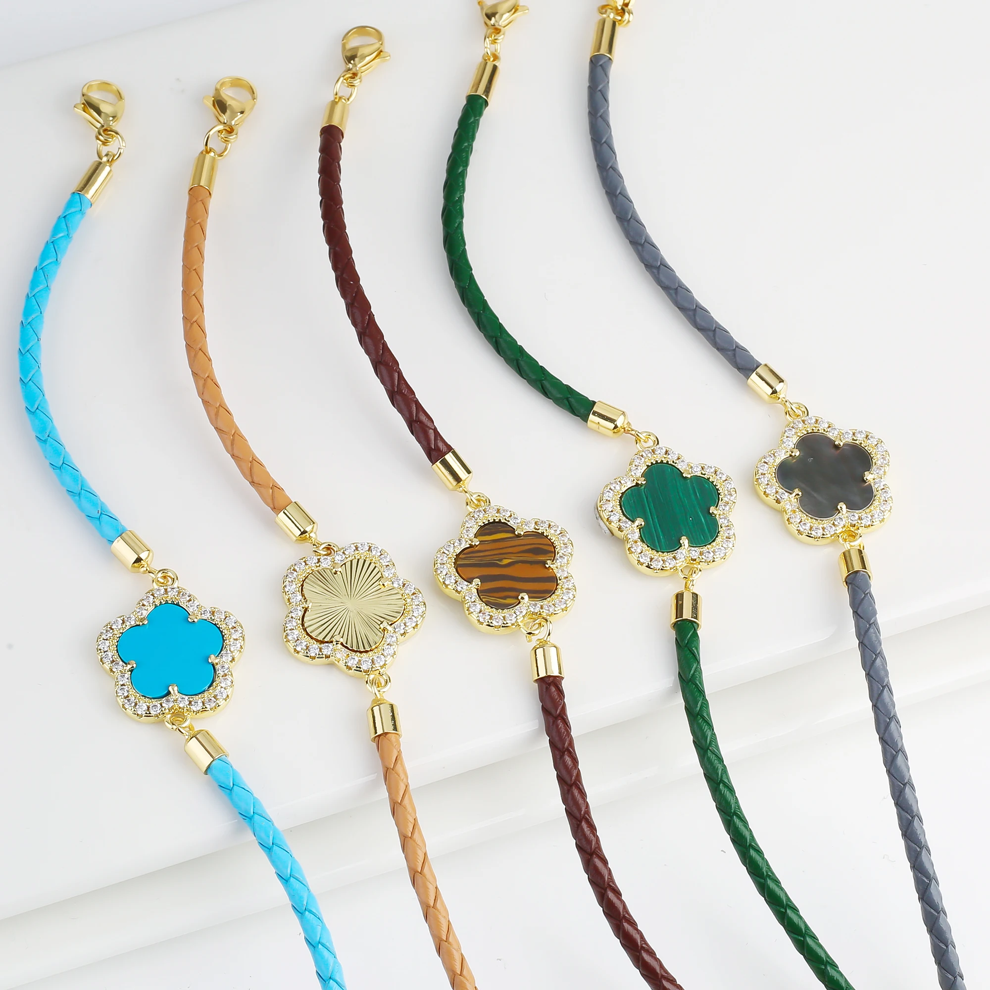 Name: 2024 Classic Shiny Zirconia Stone Five Leaf Flower Leather Braided Bracelet Fashion for Women Party Brand Jewelry Daily Wear